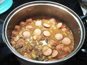 - Cook the sausages, remove them once cooked and slice into round slices.