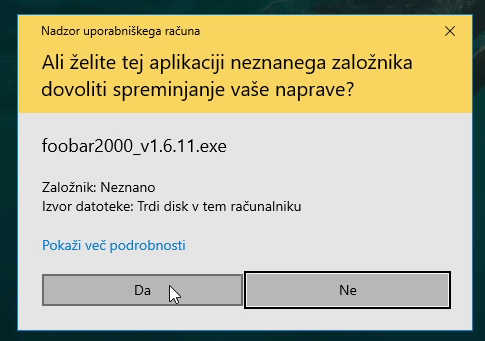 Nadzor uporabniškega računa ali katero koli drugo varnostno okno z levim gumbom miške kliknite gumb Da, da potrdite.