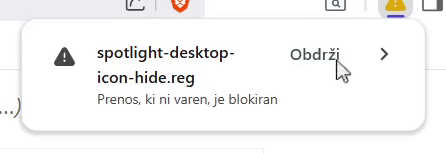 Da skrijete bljižnico uporabite spotlight-desktop-icon-hide.reg in da jo prikažete spotlight-desktop-icon-show.reg. Za prenos kliknite z desno miškino tipko na povezavo do datoteke in nato z levo miškino tipko kliknite Odprite želeno mapo kamor želite shraniti datoteko in z levo miškino tipko kliknite na tipko Če vas spletni brskalnik vpraša, če želite obdržati datoteko, kliknite tipko Korak 1: Presnamite pravilno registrsko datoteko