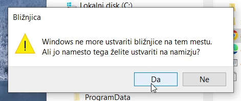 Ustvari bližnjico. Če je mapa zaščitena boste prejeli napako in s levo miškino tipko kliknite na tipko Da če želite izdelati bližnjico na namizje, če pa želite prekiniti postopek pa kliknite s levo miškino tipko tipko Ne.