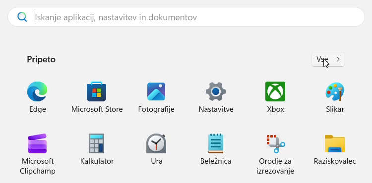 Windows 11 Start meni izgleda drugače kot v Windows 10 zato če želite videti seznam programov z levim gumbom miške kliknite na gumb Vse >.
