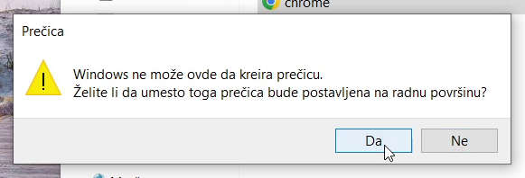 Kreiraj prečicu. Ako je fascikla zaštitena če dobijete grešku i levim dugmetom miša kliknite dugme Da ako želite napraviti prečicu na radnu površinu ako želite prekinete postupak pa levim dugmetom miša kliknite na dugme Ne.