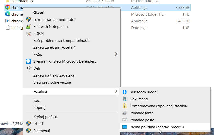 Pošalji u, a zatim kliknite levim dugmetom miša na Radna površina (napravi prečicu) ili bilo koju opciju želite.