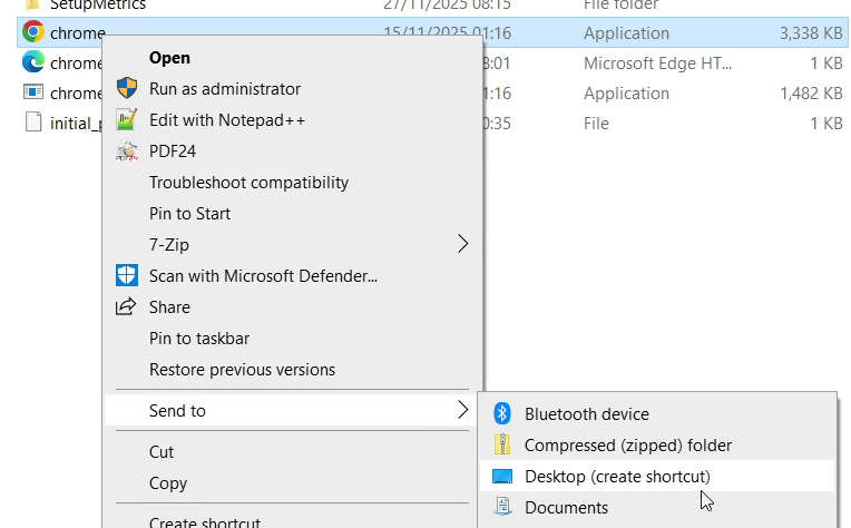 Send to and then left mouse button click on the Desktop (create shortcut) or what ever option you want.